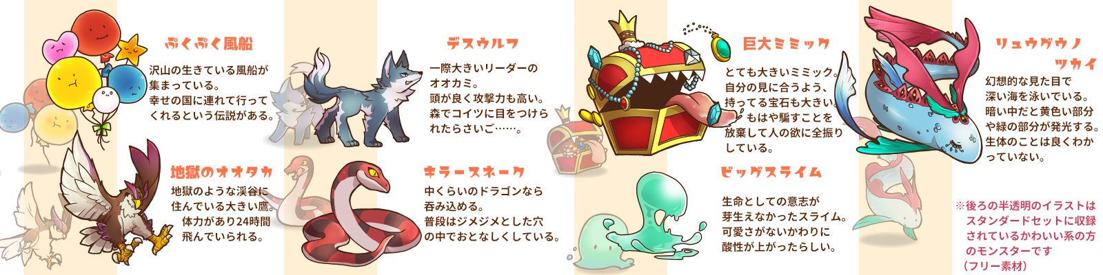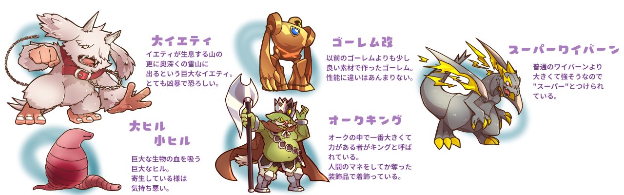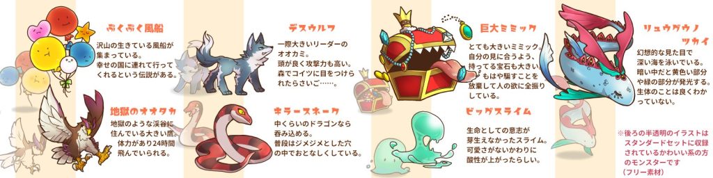 あと人型のモンスターも多いので華があるかと!オマケのキャラもデザイン頑張ったので見てもらえると嬉しいです😊