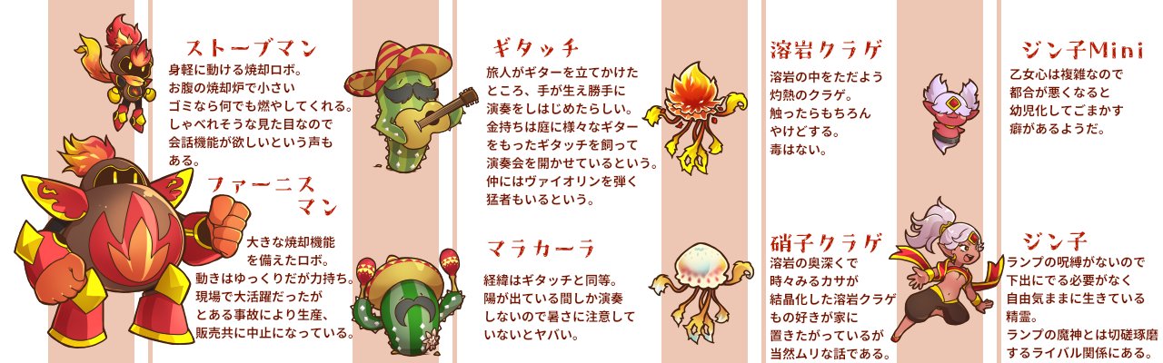 地獄、魔界のお題で案いただいたので地獄関係で炎系も結構います。
